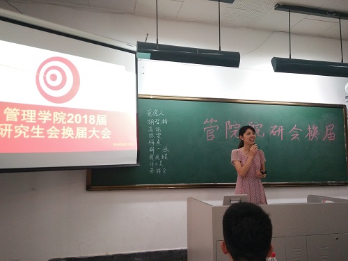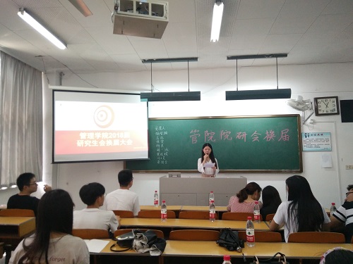 大会共分为六个部分,首先由研究生辅导员华奕曦老师进行嘉宾讲话。华老师对上届管院研会的付出作出了肯定与表扬,同时也对下一届的研会的发展表达了深切的期待。接着现任主席赵海超同学总结了这一年来研会的工作,肯定并感谢老一届成员对研会做出的牺牲和贡献,简述了研会的活动及工作情况,鼓励下一届研会成员要用良好地心态去迎接往后的学习和工作并对研会今后的发展提出了要求,做出了展望。