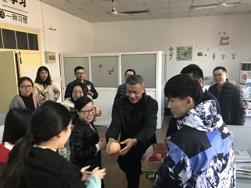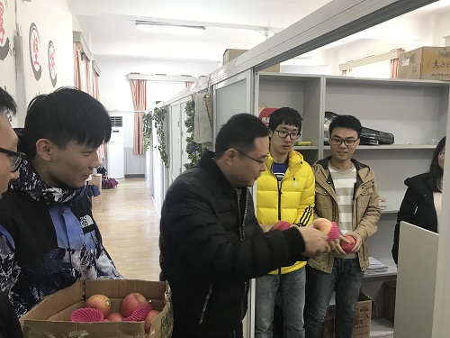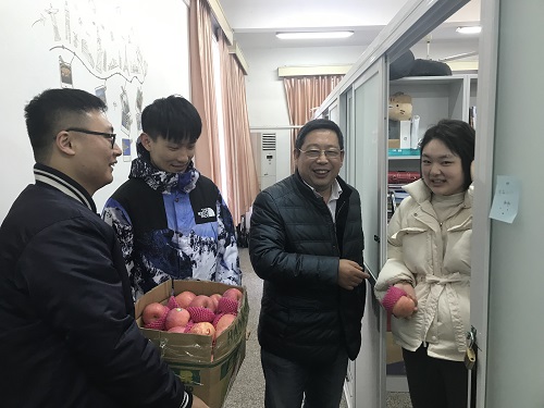 2018年12月24日上午10点左右,有线楼伟德bv1946官网的六个教研室里传出阵阵欢乐的笑声。伟德bv1946官网院长黄卫东、党委书记江森、副院长卢子芳、副院长朱卫未、副书记邓艳华、研究生辅导员华奕曦带着满满两箱红彤彤的大苹果去看望正在教研室学习的研究生。正值平安夜,把平平安安的祝福、暖人心的话语送给同学们。