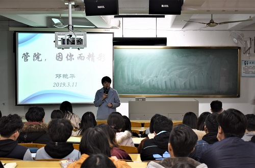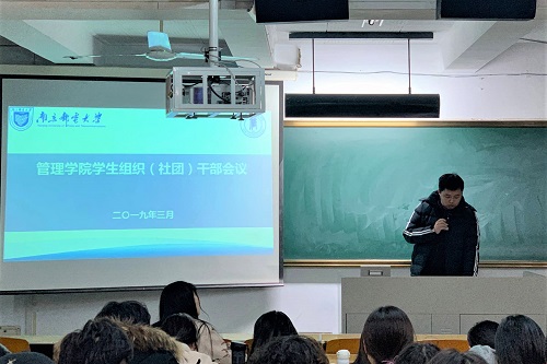邓书记首先总结了上学期学生社团工作,并对接下来要开展的工作提出了新的展望。邓书记讲到,自管院扎根三牌楼以来,大家勇于开拓,大胆创新,倾注了无数心血,取得了骄人的成绩。在接下来的工作中,大家要秉承管院“家”的文化,凸显学院特色,紧跟信息化时代的趋势,推陈出新,进一步融入大校氛围,工作不断线、品牌再深化,激荡出新的浪花,为奔向更广阔的大海共同努力。随后,学院分团委书记刘老师向全体学生组织(社团)干部提出要求,希望大家讲政治、提素养,以《学生会,研究生会干部自律公约》严格规范自身的思想言行,恪守学生本分,永葆理想主义情怀,摒弃庸俗习气。最后,就本学期具体工作的开展,刘老师也提出了一系列要求。