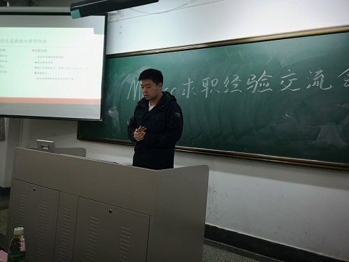首先,签约于天职国际会计师事务所江苏分所的李泽卿师哥上台分享了他在多家事务所实习的经历。他着重强调了团队精神的重要性,分析了江苏省排名靠前的11家事务所的特点,使同学们对多家事务所的前身和发展有了充分的了解。