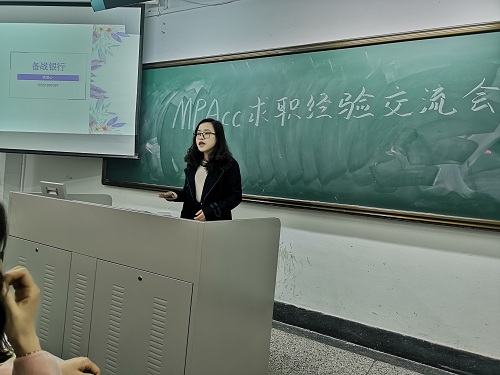 随后,已签约农业银行南京分行的梅馨心师姐上台分享了她的求职经历。她为大家着重讲解了银行求职的流程,分享了她在网申、笔试、一面、二面归纳出的题型和经验,使同学们对求职的各个环节有了清晰的认知。