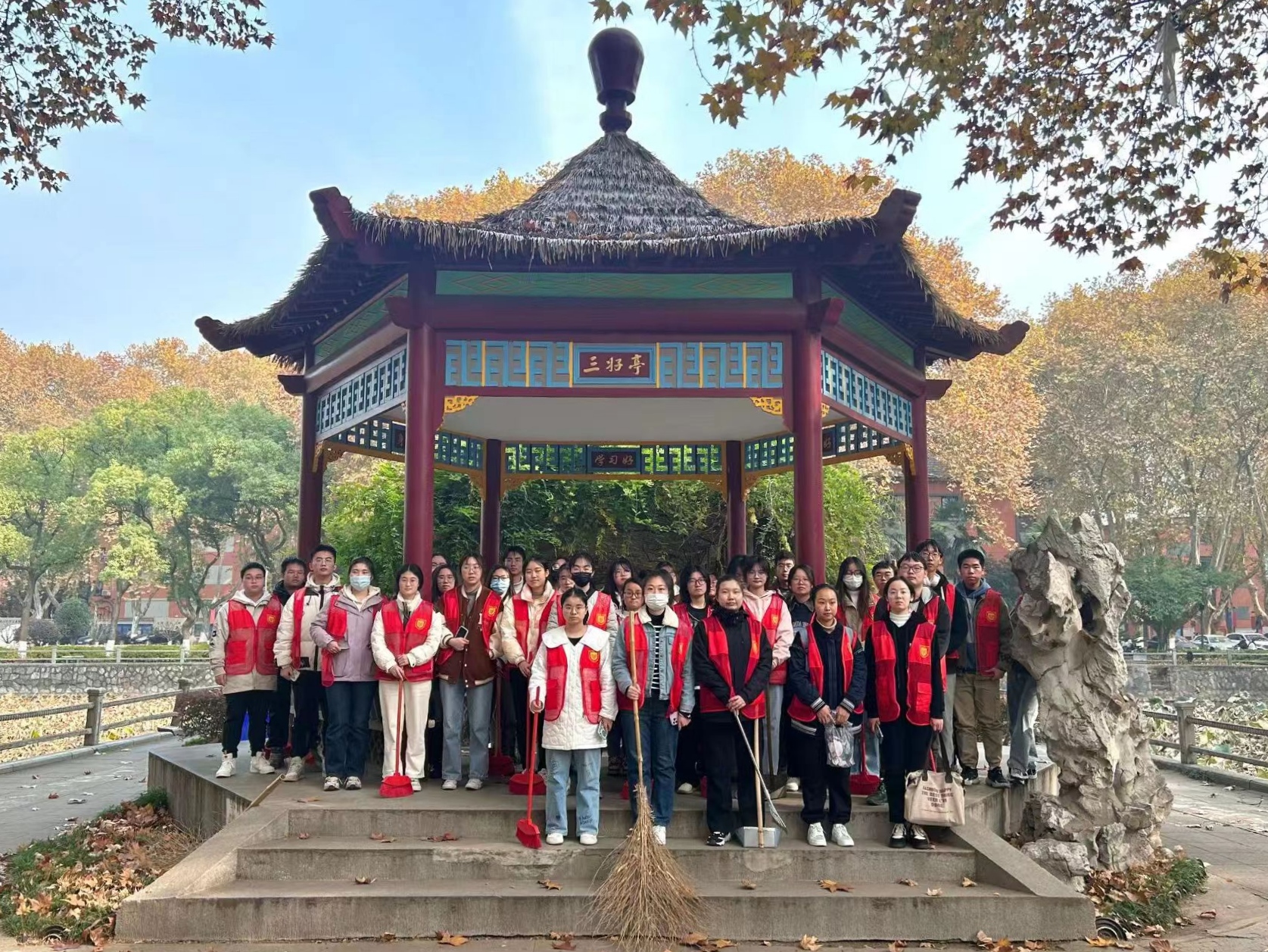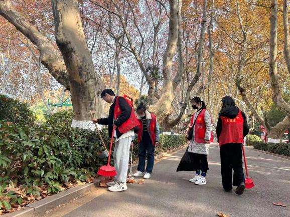 冬日的午后,吹着丝丝凉风,志愿者们在分配好任务后开始了各自的清扫工作。眼镜湖旁、行政南楼边、篮球场以及假山周围都有他们劳动的身影。鲜艳的红马甲像一团团火焰,驱散了冬日的严寒,让校园充满温情。