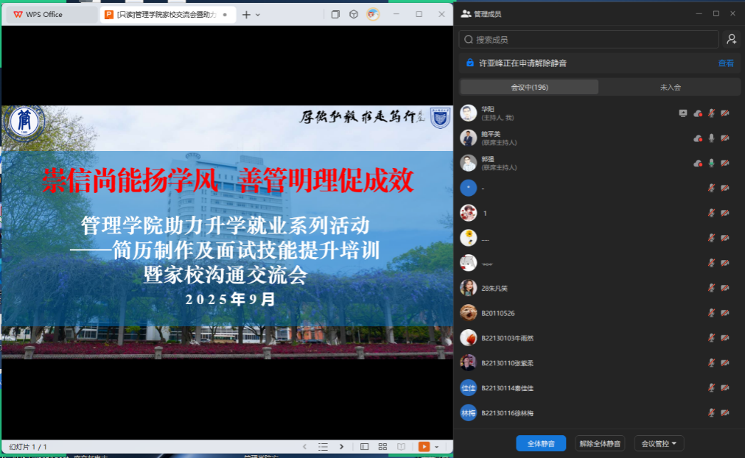 为进一步提升学院学生求职就业能力,做好学生就业指导工作,同时凝聚家校合力,为学生高质量就业保驾护航。9月22日晚,学院开展助力升学就业系列活动——简历制作及面试技能提升培训暨家校沟通交流会,特邀就业与简历培训专家进行系统培训。学院党委副书记、副院长郭强教授,毕业班辅导员老师以及学院学生和家长参与交流会。
